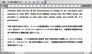 翻訳エンジン翻訳ソフトで最も重要なのはもちろん翻訳エンジンです。 試しに Voice of America のWEBページから:どうですか? 「翻訳」のレベルにするには後編集が必要ですが、十分に意味がわかる訳文が出力されています。これならリライトする気になるでしょう。 辞書基本語辞書:英日: 1,050,000語 / 日英: 1,240,000語日外アソシエーツ180万語科学技術辞書:英日: 900,000 / 日英: 900,000 これだけの膨大な辞書に加えて、スタンダード版には7分野の専門語辞書(英日: 320,000語 / 日英: 330,000語)、プロフェッショナル版には27分野の専門語辞書(英日: 1,212,000語 / 日英: 1,319,000語)が搭載されています。 因みに、最近の翻訳ソフトは以前に比べて翻訳成功率がかなり高まっていますが、これは、たゆまぬ辞書の開発がその理由の1つだと言えるでしょう。さすがにこれだけの語数があれば原文のまま出力されることも少なくなります。「未知語リスト出力」を行ってもスラングや固有名詞ぐらいしかリストアップされません。 ただ、ここで注意しなければならないのは、辞書の内容です。ひとつの見出し語に対する訳語が豊富にあるかどうかによって使い勝手が大きく変わってきます。もちろん、出力されるのは一つの訳語ですので、文脈に合わない場合は訳語変更機能で別の訳語に変更するわけですが、訳語の数が多いほど選択肢が増えます。選択肢が少ない場合は必然的に辞書登録をする頻度が高くなり効率が落ちます。この点、翻訳スタジオの訳語はかなり充実しています。 ただ、やたらに訳語を増やすだけではあまり意味がありません。できるだけ適切な訳語を出力する仕組みが必要です。そこで、訳語とともに文法情報も書き込むことができるようになっています。例えば前出の文章でchangesの訳語リストを見ると、「(〜における)変更 <(at/in ACTION)>」となっています。<図1> <図1>changesの訳語リストこれはchangeの後ろにatかinの前置詞句が来たときは「〜における変更」と訳出するように指定されているということで、「ACTION」は意味素性と呼ばれる意味のカテゴリーを表す記号です。このように、「changes in his Iraq policy」が「彼のイラクの政策における変更」という訳は、「in」を場当たり的に「における」と訳しているのではないことがわかります。 対訳エディタ翻訳ソフトを翻訳作業に活用するには「対訳エディタ」の使い勝手が最も重要です。使い勝手が悪く、ストレスを感じるようでは誰も使わないでしょう。その点PC-Transerの対訳エディタは従来から極めて使いやすいと評判でしたが、翻訳スタジオ2007になっても使いやすさはそのまま受け継がれています。